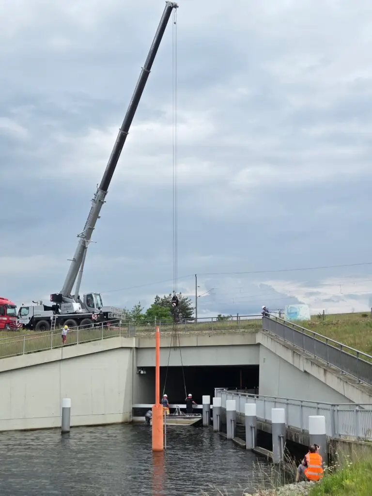 Dazu hatte das ausführende Unternehmen Metzner GmbH entsprechende Technik aufgebaut und bis zum 16. Februar 2026 bereits die ersten sieben Dalben in den Kanalgrund von der Landseite aus eingerammt.