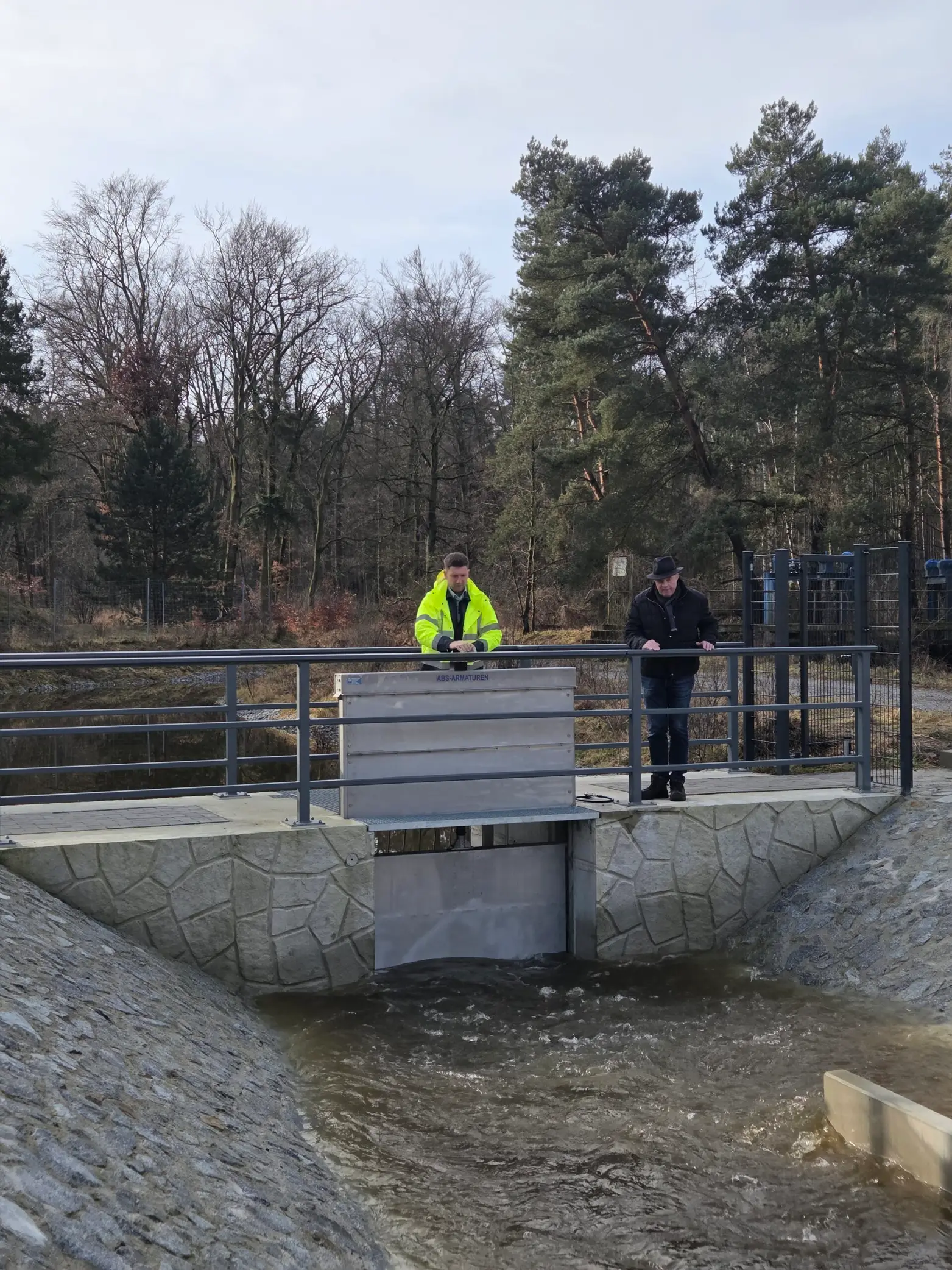 Projektmanager Christoph Hill öffnet die Wehrtafel. Wasser marsch.