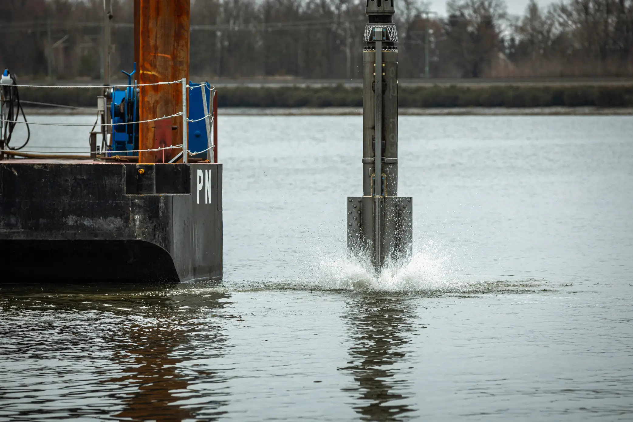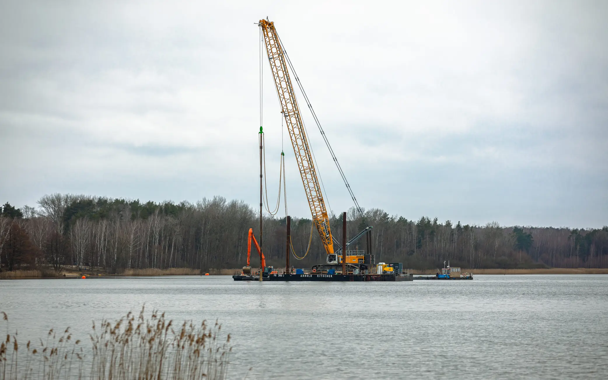 Die Rammarbeiten für die ersten Festmach- und Schutz-Dalben wurden trotz witterungsbedingter Herausforderungen, wie Frost, Schnee und acht Zentimeter dickem Eis im Kanal begonnen und werden in den kommenden Tagen weiter umgesetzt.