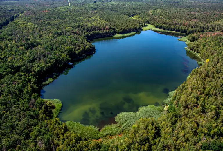 Tagebaurestloch Golpa IV aus der Luft (Archivfoto 2019: LMBV/Peter Radke) und vom Boden (2020: LMBV/Sylke Hochmuth)